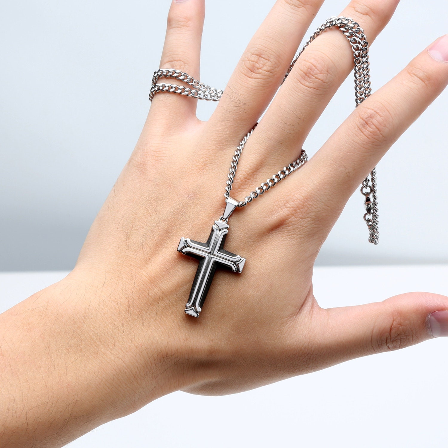 Este pack incluye dos collares cruz para hombre, perfectos para dar un toque de estilo a cualquier look. Uno es de acero inoxidable plateado con un diseño clásico y detalles tallados, y el otro es de color negro con líneas más modernas y duras. Ambos están hechos de acero inoxidable de alta calidad, resistente a la corrosión y que no provoca alergias, por lo que son cómodos de llevar a diario. Los cierres son fuertes y seguros, para que no se abran accidentalmente. Son versátiles: valen para un estilo retro, punk o casual. Vienen presentados de forma elegante, ideales como regalo para amigos, familiares o pareja en ocasiones especiales. ¡Un detalle con significado y mucho estilo!