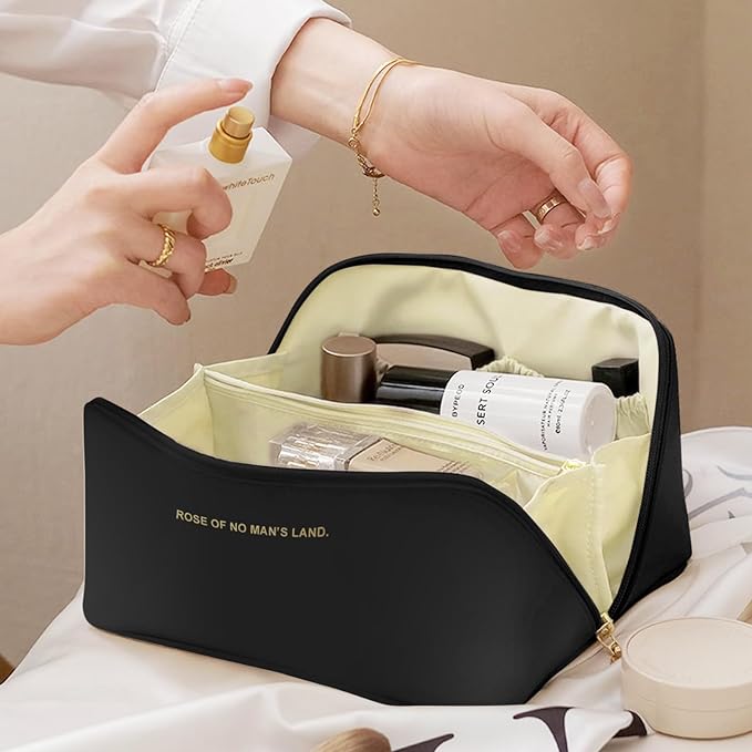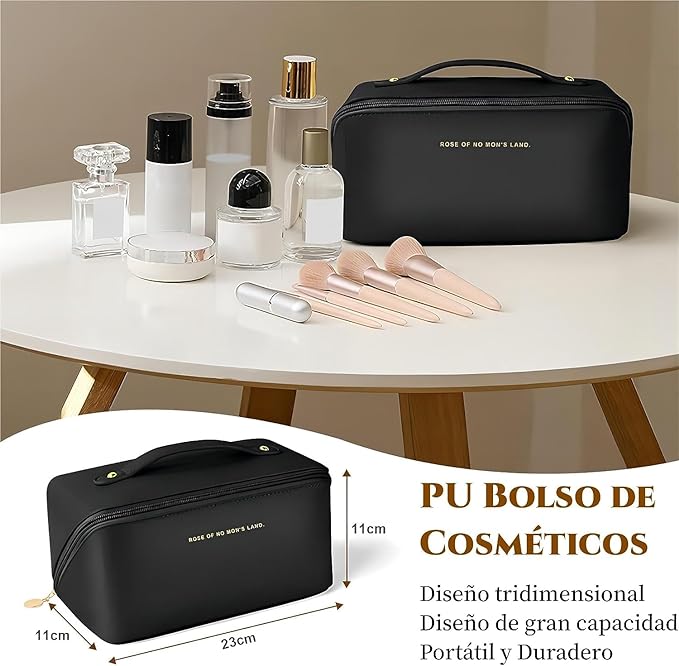 ¿Viajas mucho o simplemente quieres tener tu maquillaje y productos de aseo ordenados? Este neceser grande es tu mejor aliado. Está hecho de cuero PU impermeable, así que no te preocupes si se moja: se limpia con un paño y listo. Tiene un montón de compartimentos: bandas elásticas para sujetar frascos verticales, bolsillos internos para pinceles, cremas, champús, cepillo de dientes… lo que sea. Mide 25 x 18 x 11 cm, es ligero pero con capacidad de sobra para llevar todo lo esencial. Las asas son anchas y cómodas para llevarlo en la mano o colgarlo. La cremallera es doble, se abre de par en par para que veas todo de un vistazo. Vale tanto para viajes, gym, fines de semana, como para tenerlo en casa y que no se te pierda nada. Si eres de las que lleva medio baño encima, esta bolsa te va a salvar. Práctica, bonita y muy bien organizada. ¡No salgas sin ella!