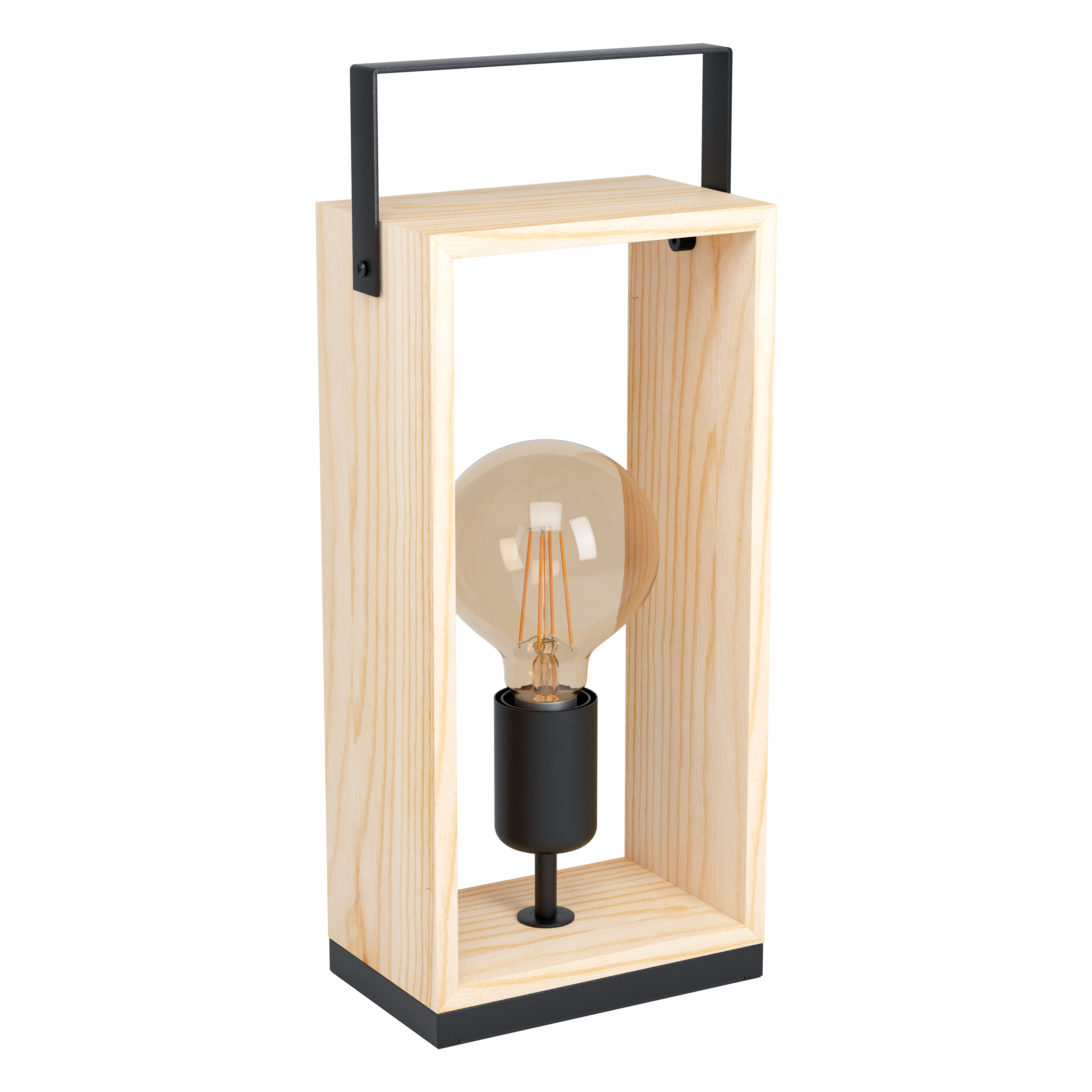 Esta lámpara de mesa Eglo Blackcrown tiene un diseño moderno y natural que queda bien en cualquier sitio. Tiene forma de cubo, con un marco de madera abierto y estructura de acero negro. Mide 20x20x20 cm, un tamaño ideal para mesitas de noche, salones o pasillos.\n\nEl casquillo es E27, compatible con bombillas estándar (máximo 40 W) y regulable si usas bombillas dimmable. La bombilla no está incluida, así que puedes elegir la que más te guste. Se enciende y apaga con un interruptor en el cable.\n\nEs una lámpara decorativa que deja ver la bombilla, creando un efecto muy acogedor. Perfecta para añadir un toque de calidez y estilo a tu hogar.\n¡Ilumina con diseño!