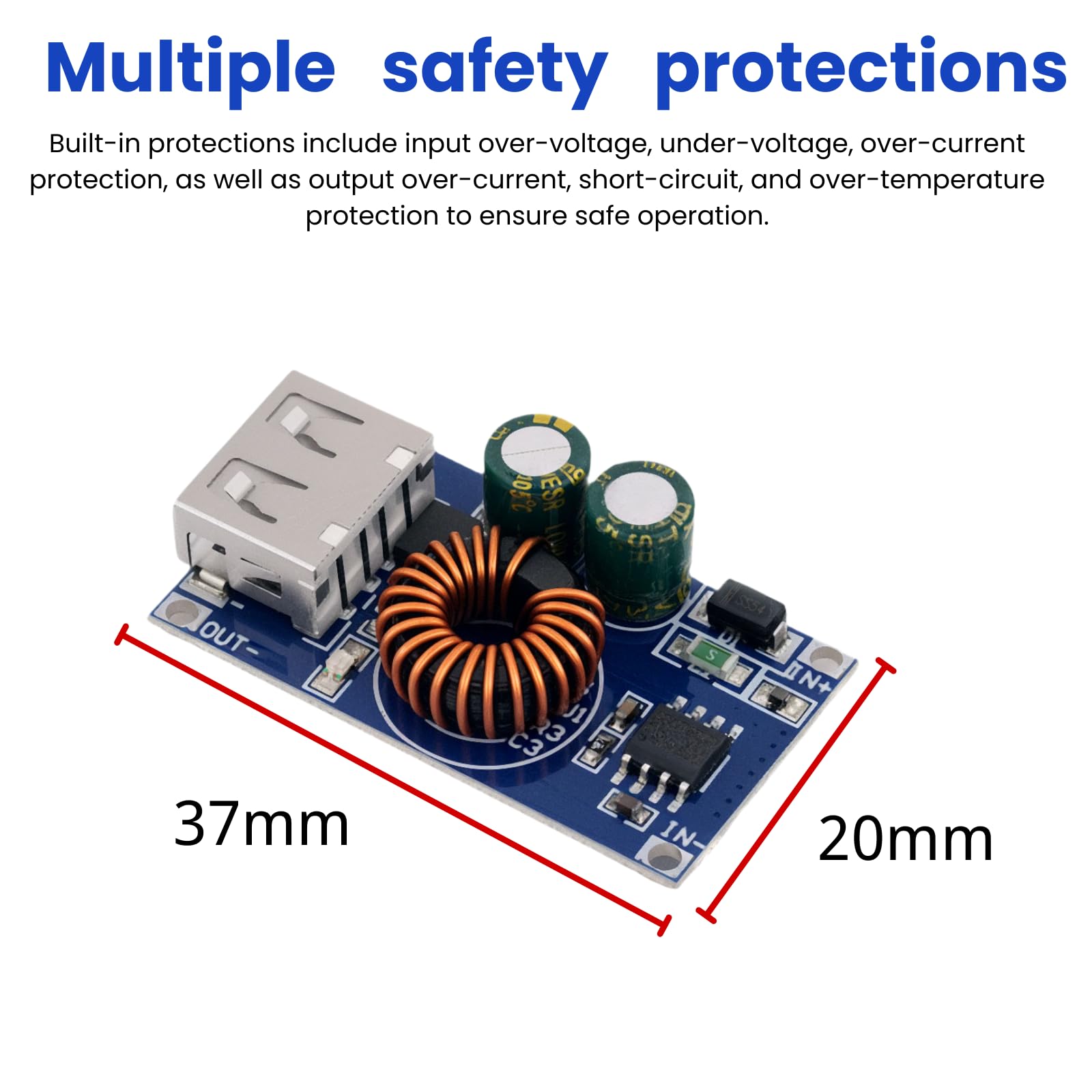 ¿Quieres cargar tu móvil o tablet en el coche, con un panel solar o una batería de 12V/24V? Este convertidor DC-DC es la solución. Convierte voltajes de entrada entre 6V y 32V (perfecto para coche 12V o sistemas solares 24V) en una salida USB de 5V con carga rápida QC2.0/QC3.0 y BC1.2. Soporta hasta 24W de potencia (5V/3.4A, 9V/2.5A, 12V/2A). Trae protecciones contra sobretensión, cortocircuito y sobrecalentamiento. Viene en un pack de 3 unidades, ideal para tener en varios sitios o para proyectos DIY. ¡Carga rápida y segura donde sea que vayas!